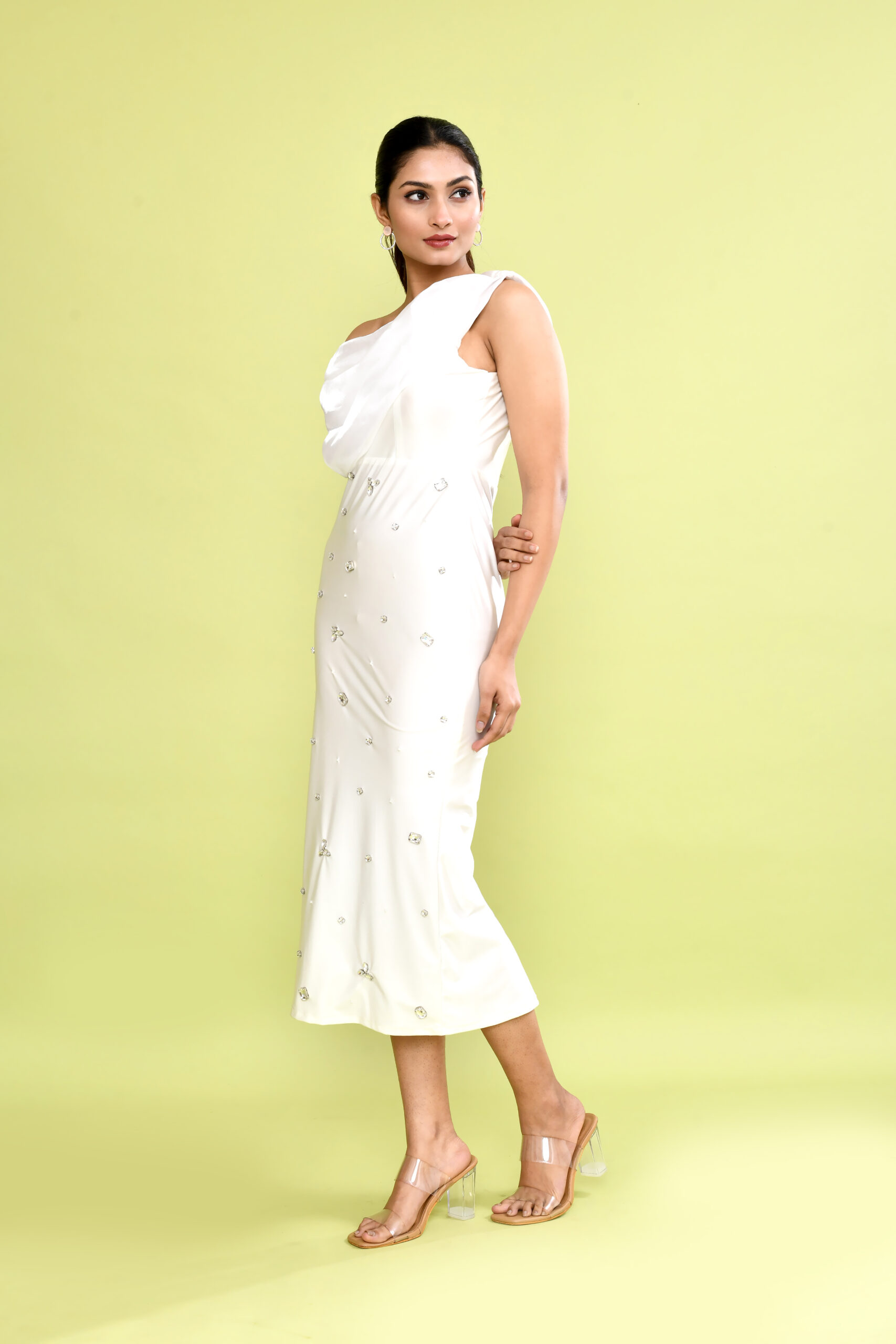 Embrace refined elegance with this stunning white one shoulder embellished midi dress designed for sophisticated occasions. Featuring a stylish asymmetrical neckline with soft draped detailing, the dress creates a graceful and modern silhouette. Delicate embellishments scattered across the fabric add a subtle sparkle, enhancing its luxurious appeal. The sleek fitted design beautifully flatters the figure while offering comfort and elegance. Perfect for cocktail parties, receptions, evening events, and special celebrations, this elegant midi dress is a timeless addition to any fashion-forward wardrobe.