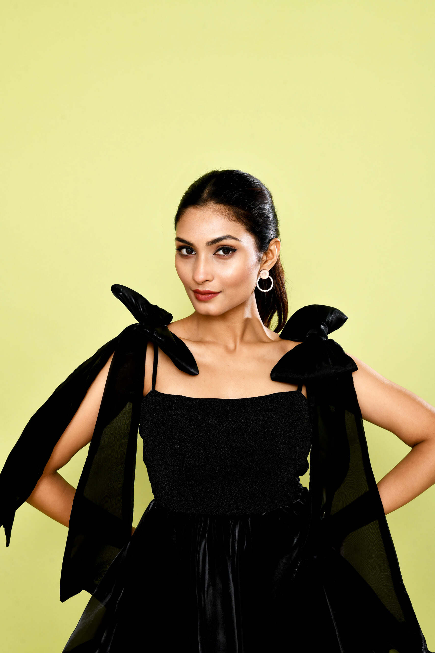 Black Organza Bow Shoulder Flared Mini Dress for Women | Elegant Party Skater DressBlack Organza Bow Shoulder Flared Mini Dress for Women | Elegant Party Skater Dress