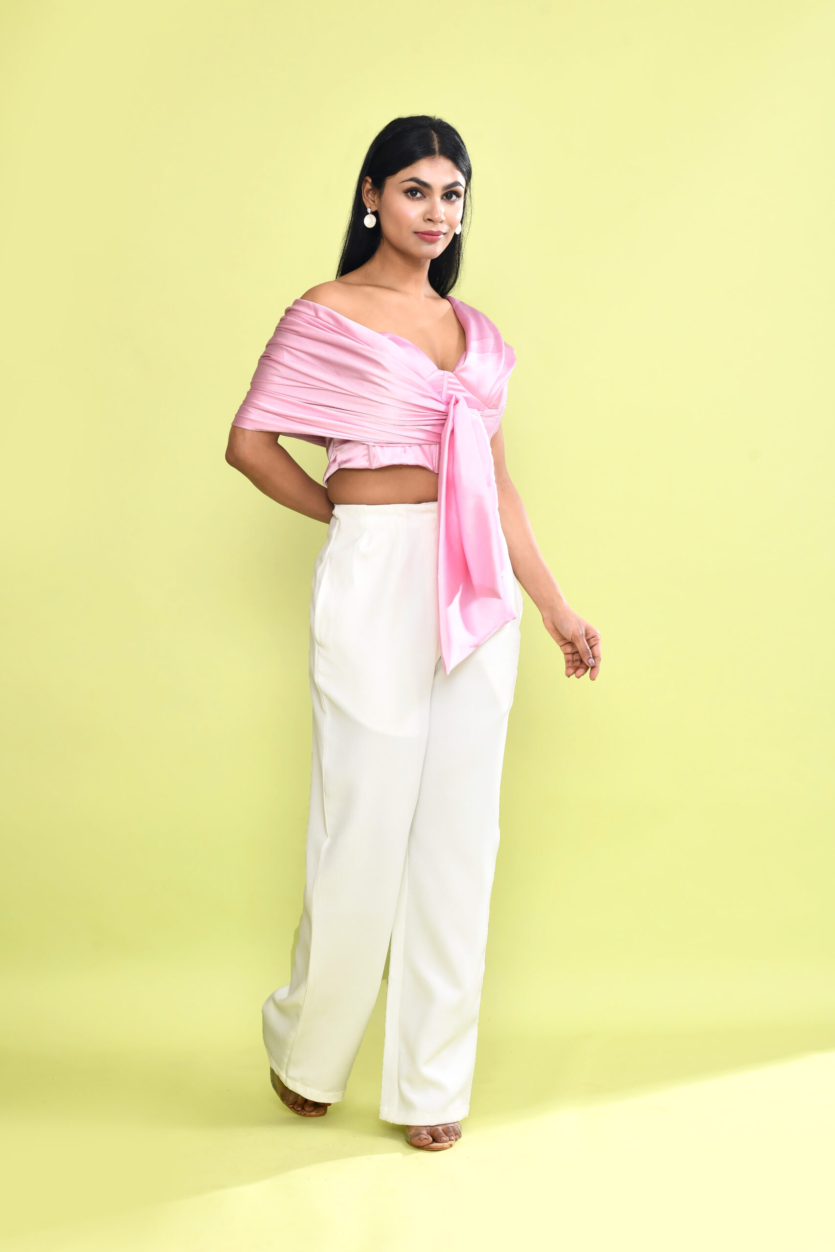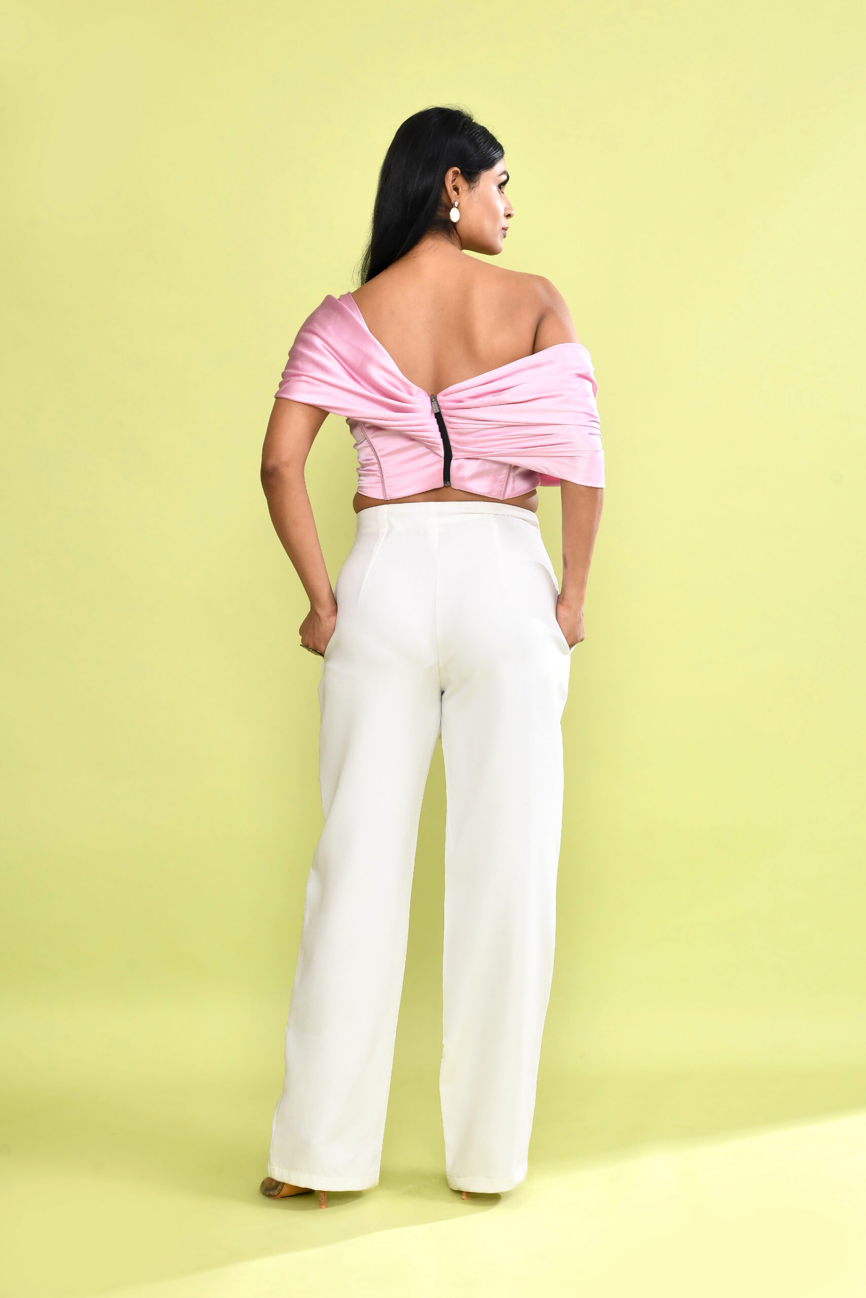 Pink Satin Off Shoulder Crop Top with White Wide Leg Pants Set for Women