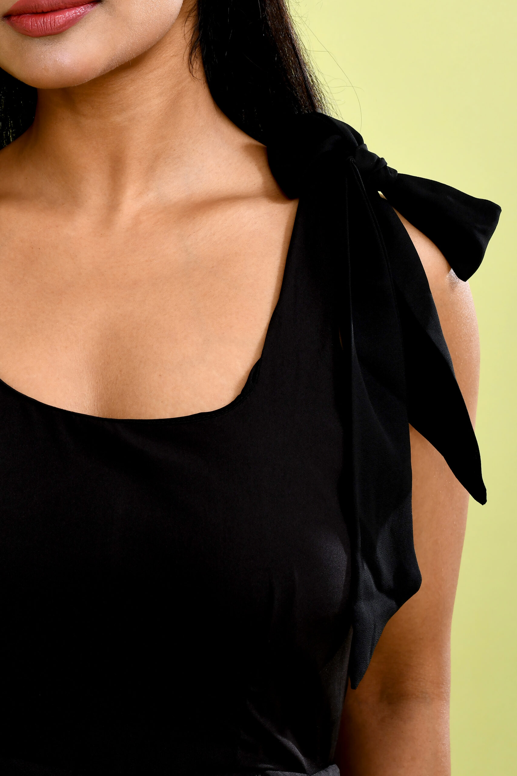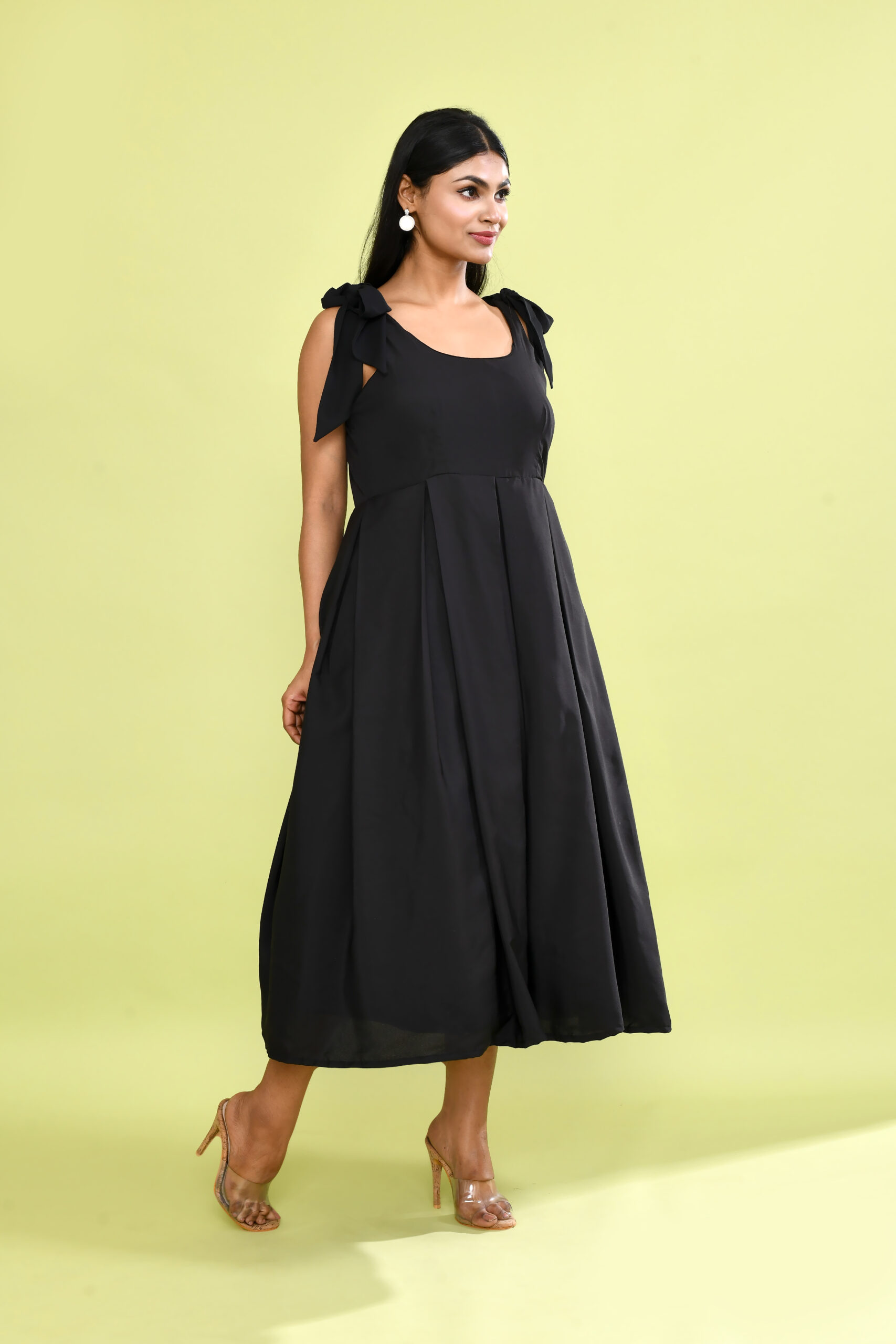 Black Tie Shoulder A-Line Midi Dress for Women | Elegant Sleeveless Flared Party Dress