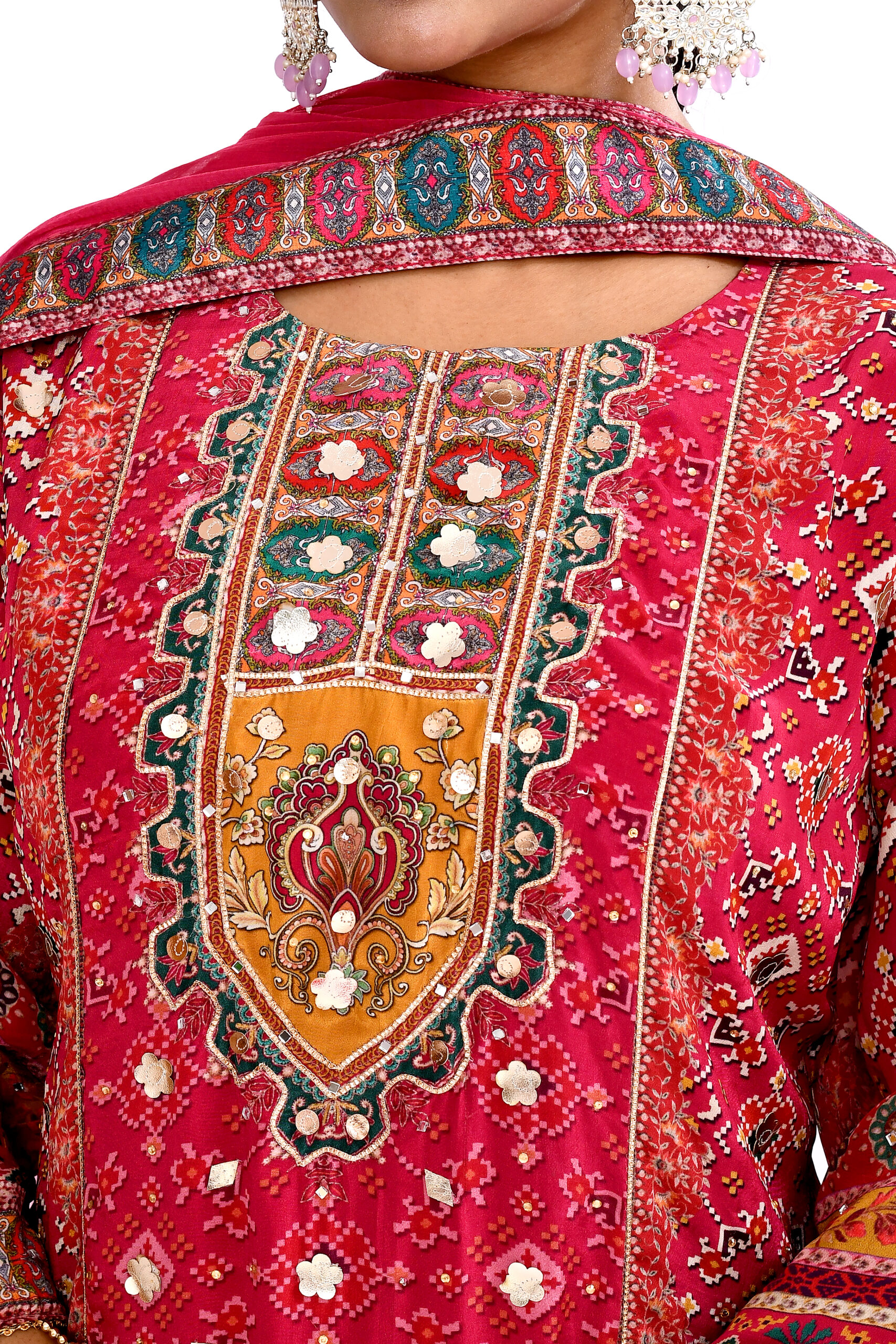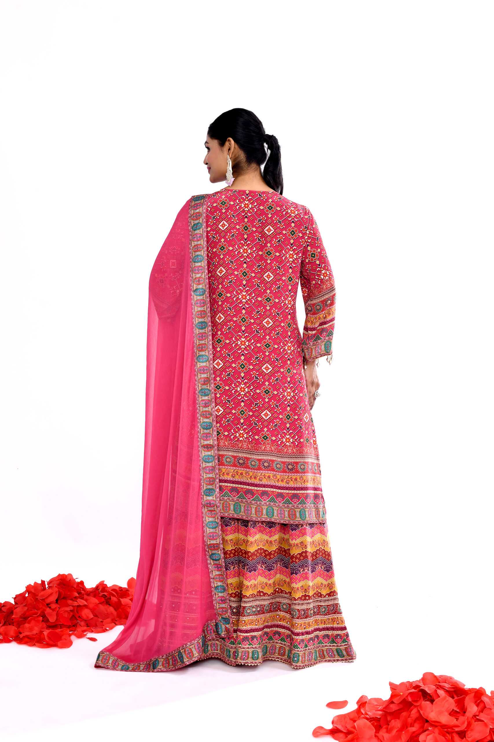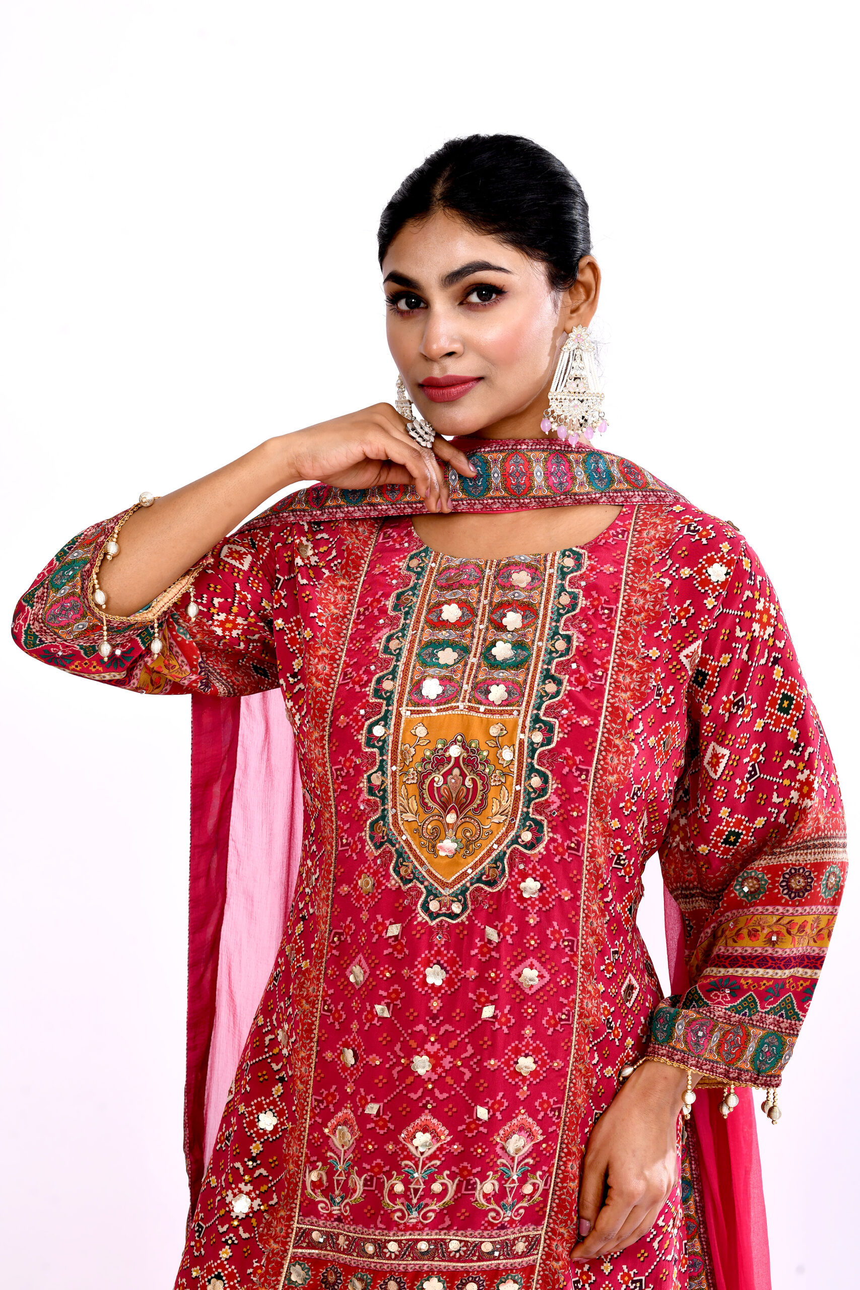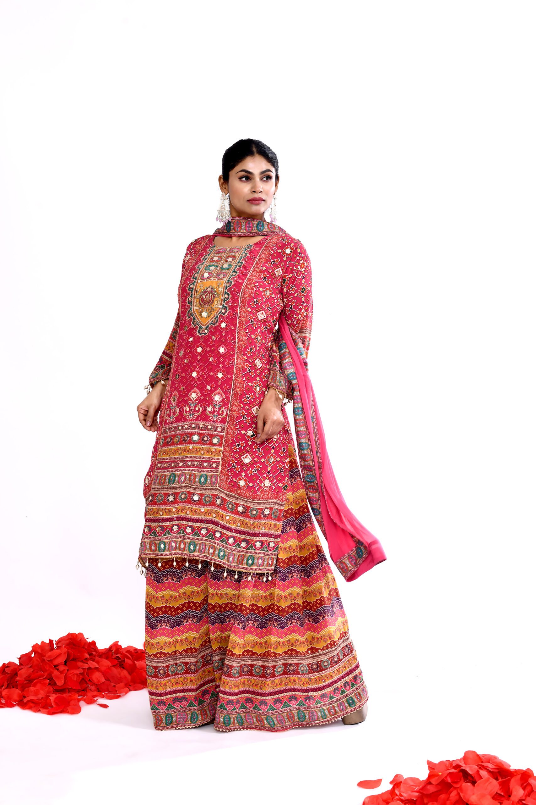 + Free ShippingEmbrace timeless ethnic elegance with this stunning red printed kurta palazzo set with dupatta. The beautifully designed straight kurta features intricate traditional prints and detailed patterns that add richness and festive charm to the outfit. Paired with wide flared palazzo pants showcasing vibrant multicolor prints, the ensemble creates a graceful and comfortable silhouette. The matching lightweight dupatta completes the traditional look, making it perfect for festive celebrations, family gatherings, cultural events, and wedding functions. Designed for the modern woman who appreciates classic ethnic style with contemporary comfort.