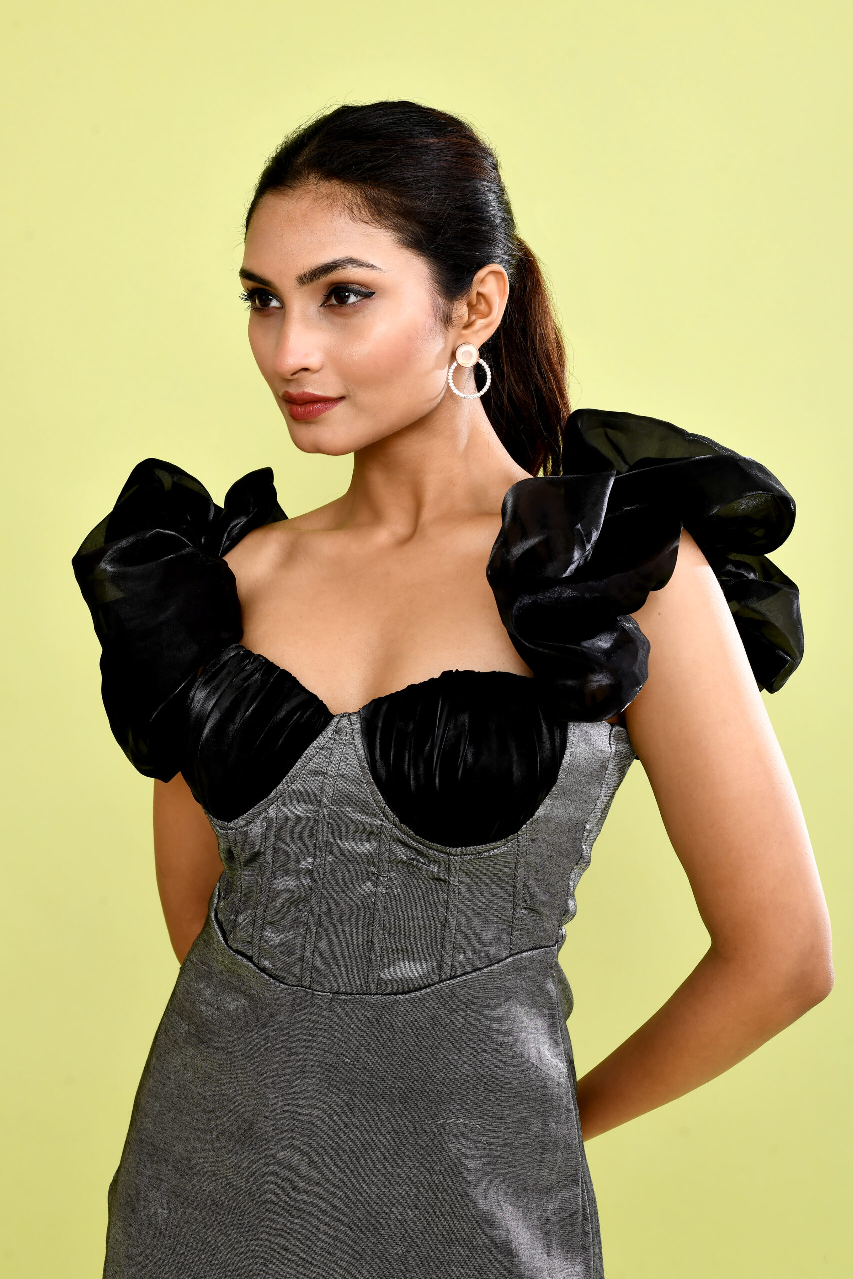 Make a bold fashion statement with this stunning silver metallic mini dress designed to stand out at every event. Featuring a structured bodice with a flattering sweetheart neckline, this dress is beautifully enhanced with dramatic black puff sleeves that add a touch of glamour and sophistication. The sleek metallic finish creates a modern and eye-catching look, while the mini length adds a playful and stylish vibe. Perfect for cocktail parties, night events, club nights, and special celebrations, this statement dress is designed for women who love confident and glamorous fashion.