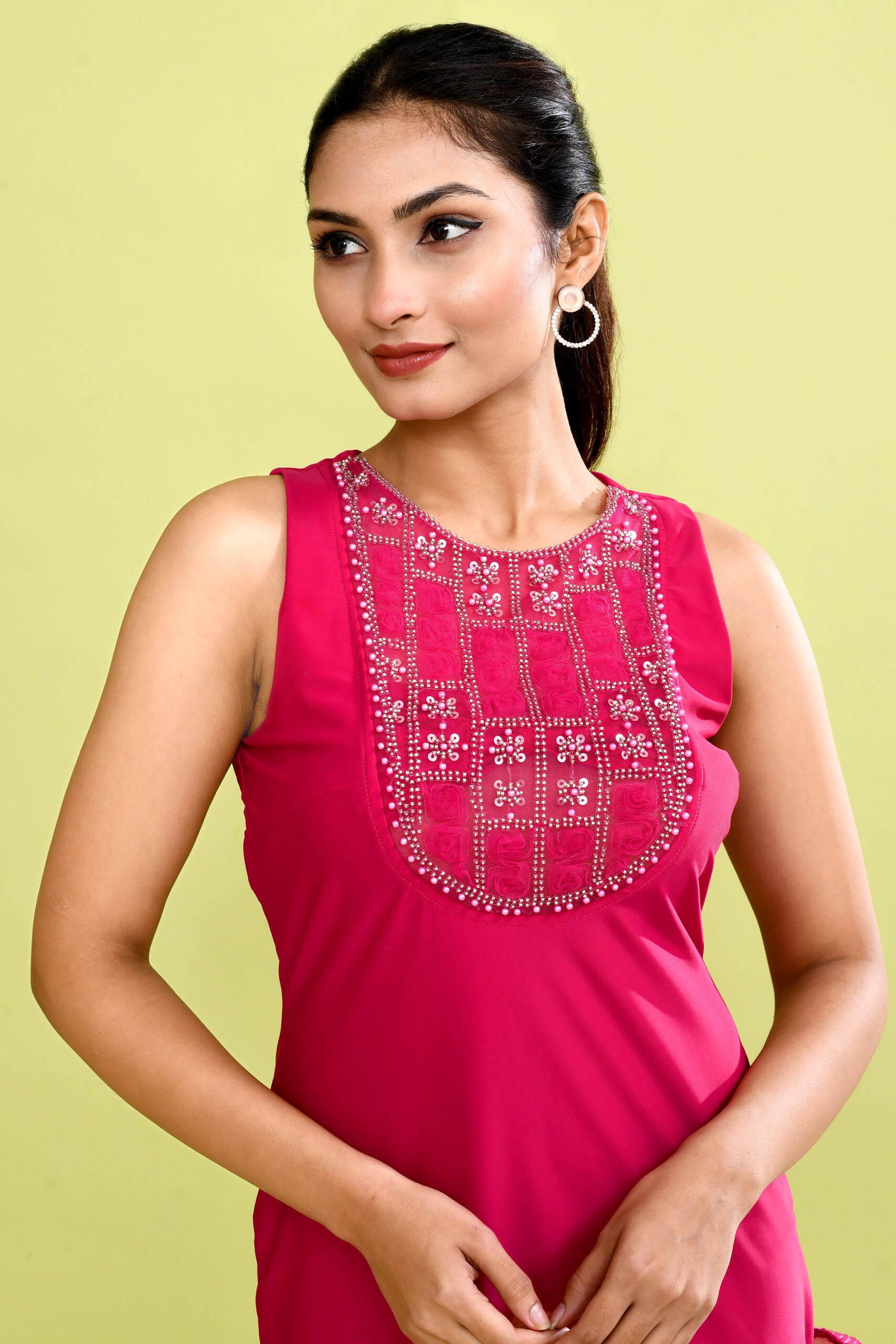 + Free ShippingMake a bold fashion statement with this stunning hot pink embroidered ruffle hem mini dress. Featuring a sleeveless silhouette with delicate embroidery on the neckline, this dress blends elegance with playful charm. The dramatic ruffled hem adds movement and flair, creating a stylish and eye-catching look. Perfect for parties, cocktail events, and special occasions, this chic mini dress is designed for women who love vibrant colors and contemporary fashion.