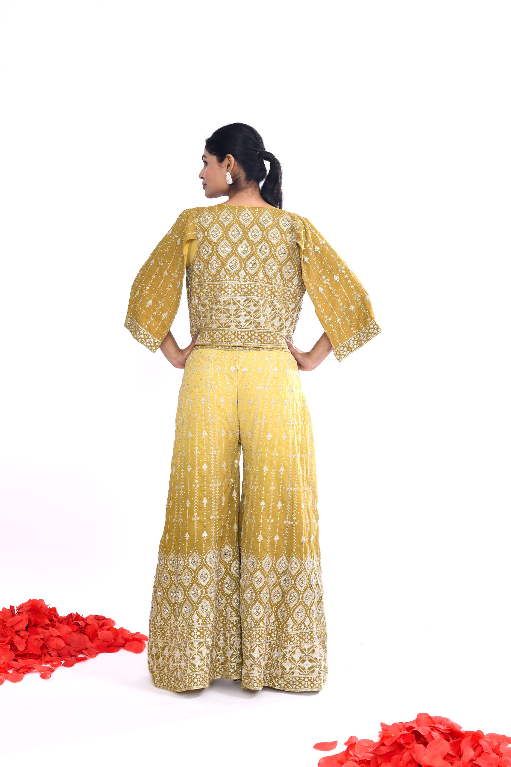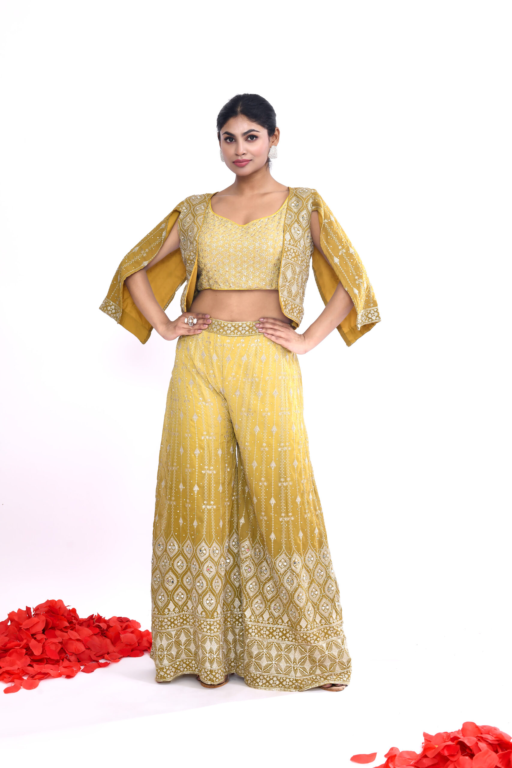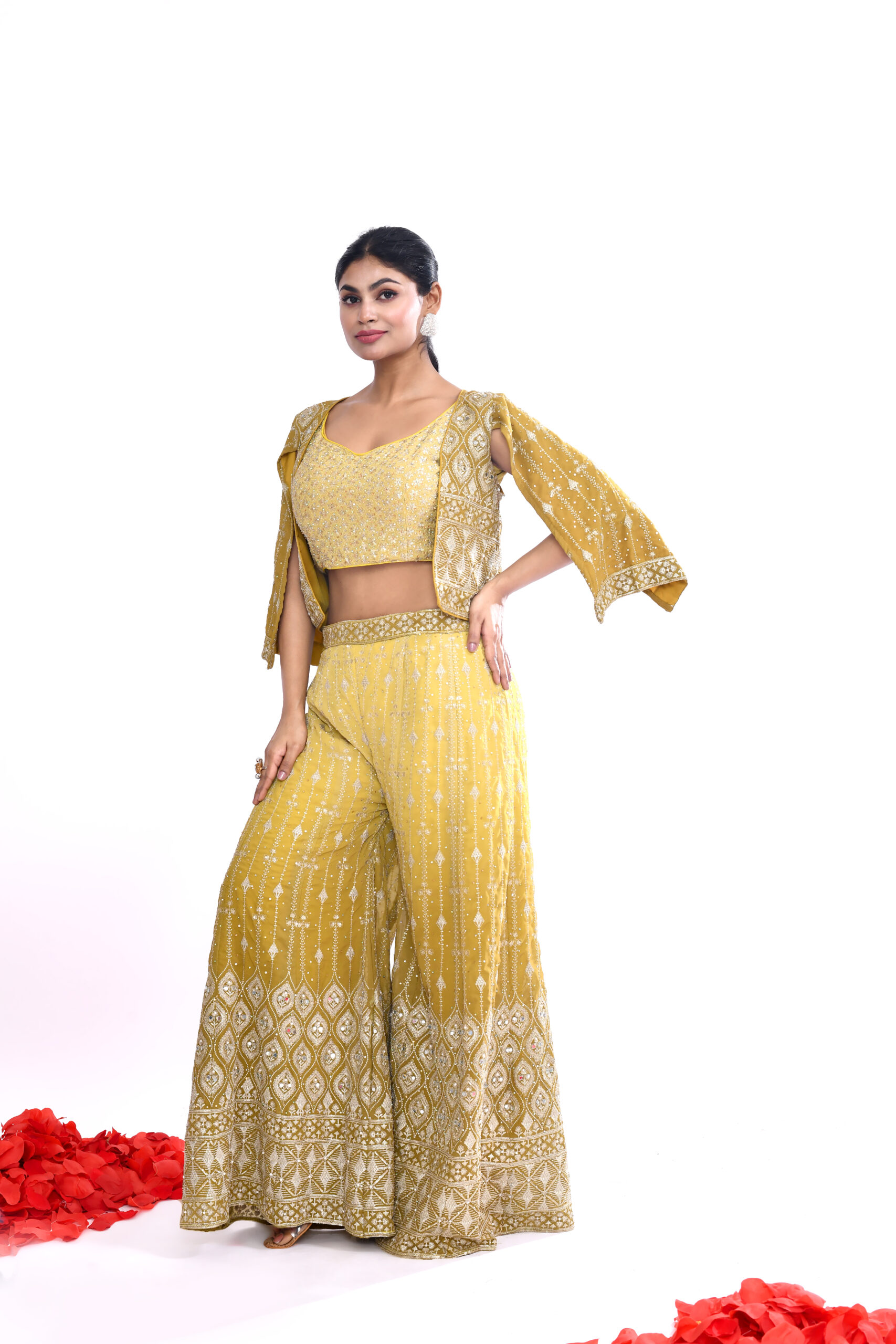 Add a vibrant touch to your festive wardrobe with this stunning mustard yellow embroidered crop top and palazzo set with jacket. The ensemble features a delicately embroidered crop blouse paired with flowy wide-leg palazzo pants for a graceful and modern silhouette. The stylish embroidered cape-style jacket enhances the overall look, adding elegance and flair. Perfect for haldi ceremonies, festive celebrations, wedding functions, and special occasions, this designer co-ord set combines comfort with contemporary ethnic style.