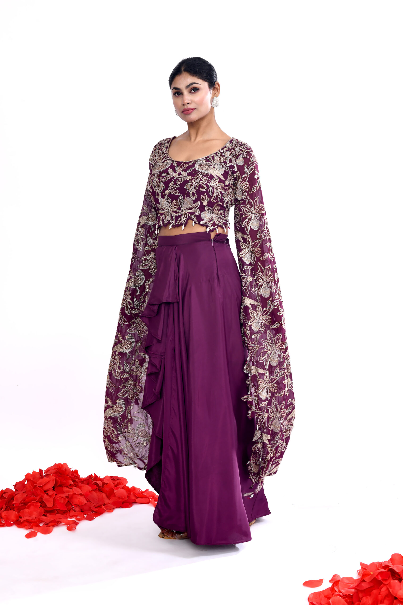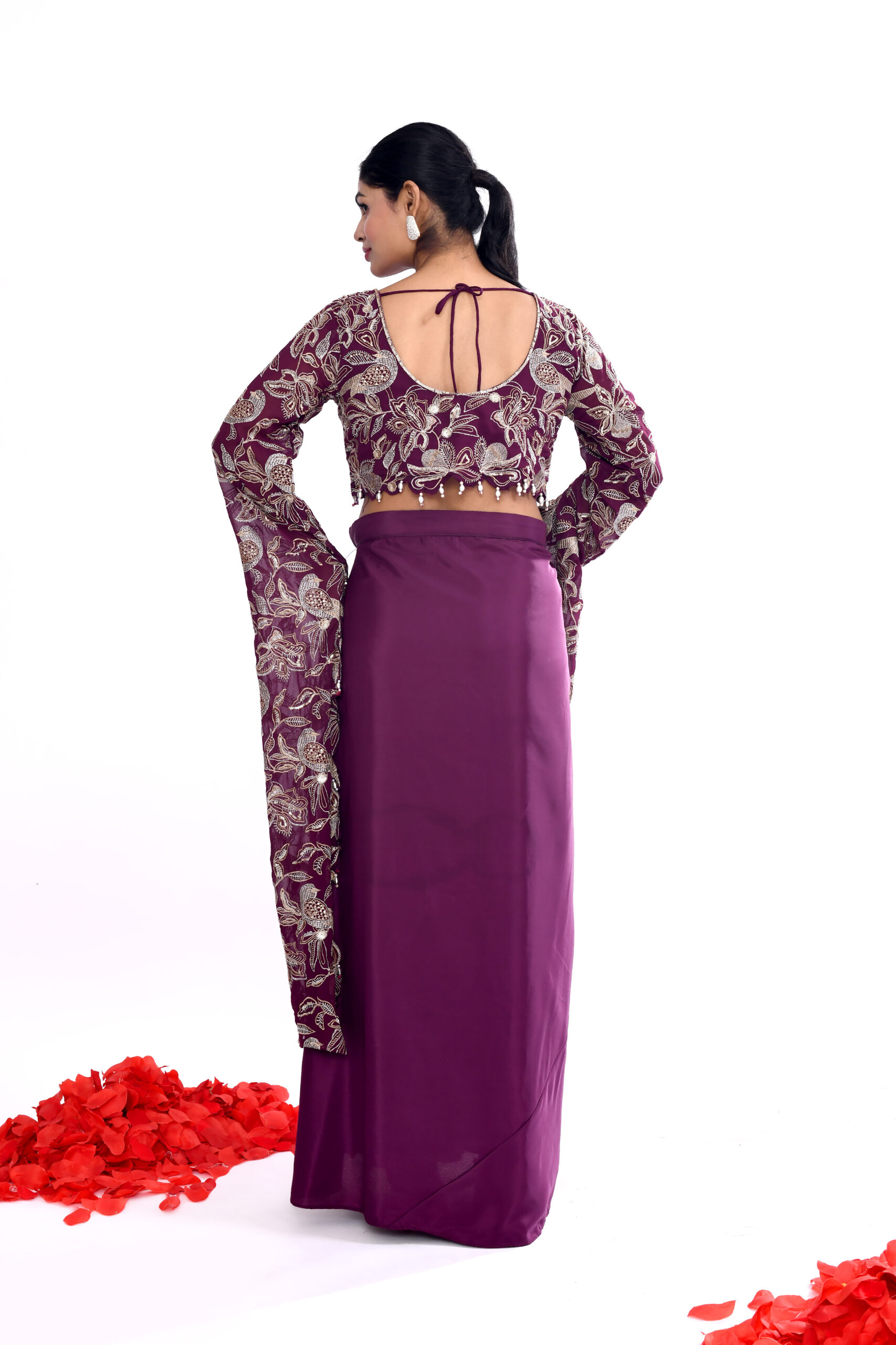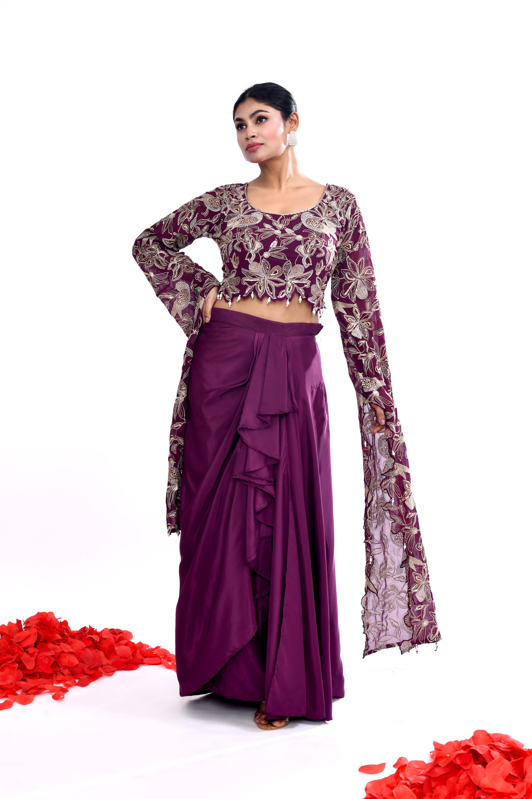 Wine Indo-western Long Sleeves Crop Top Draped Skirt Set