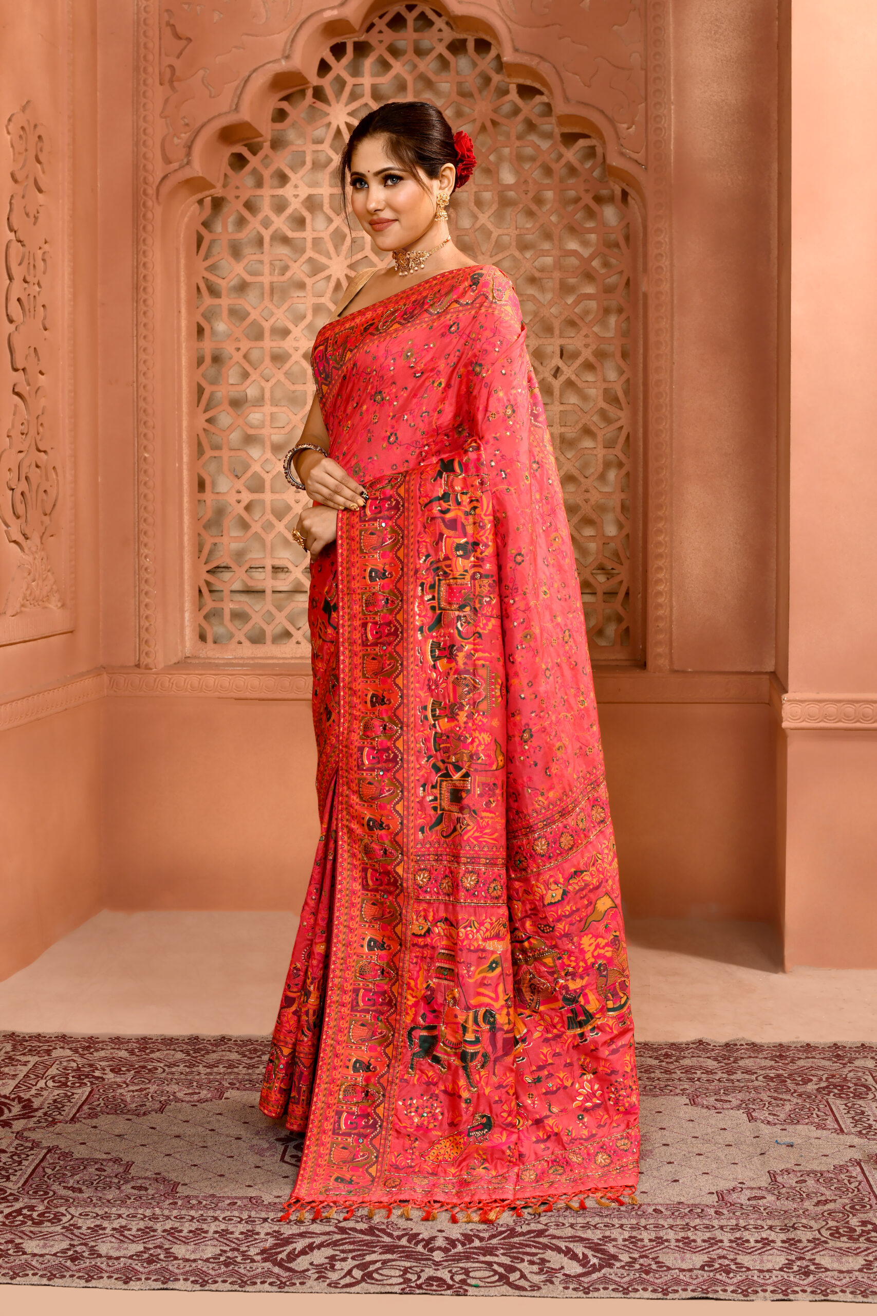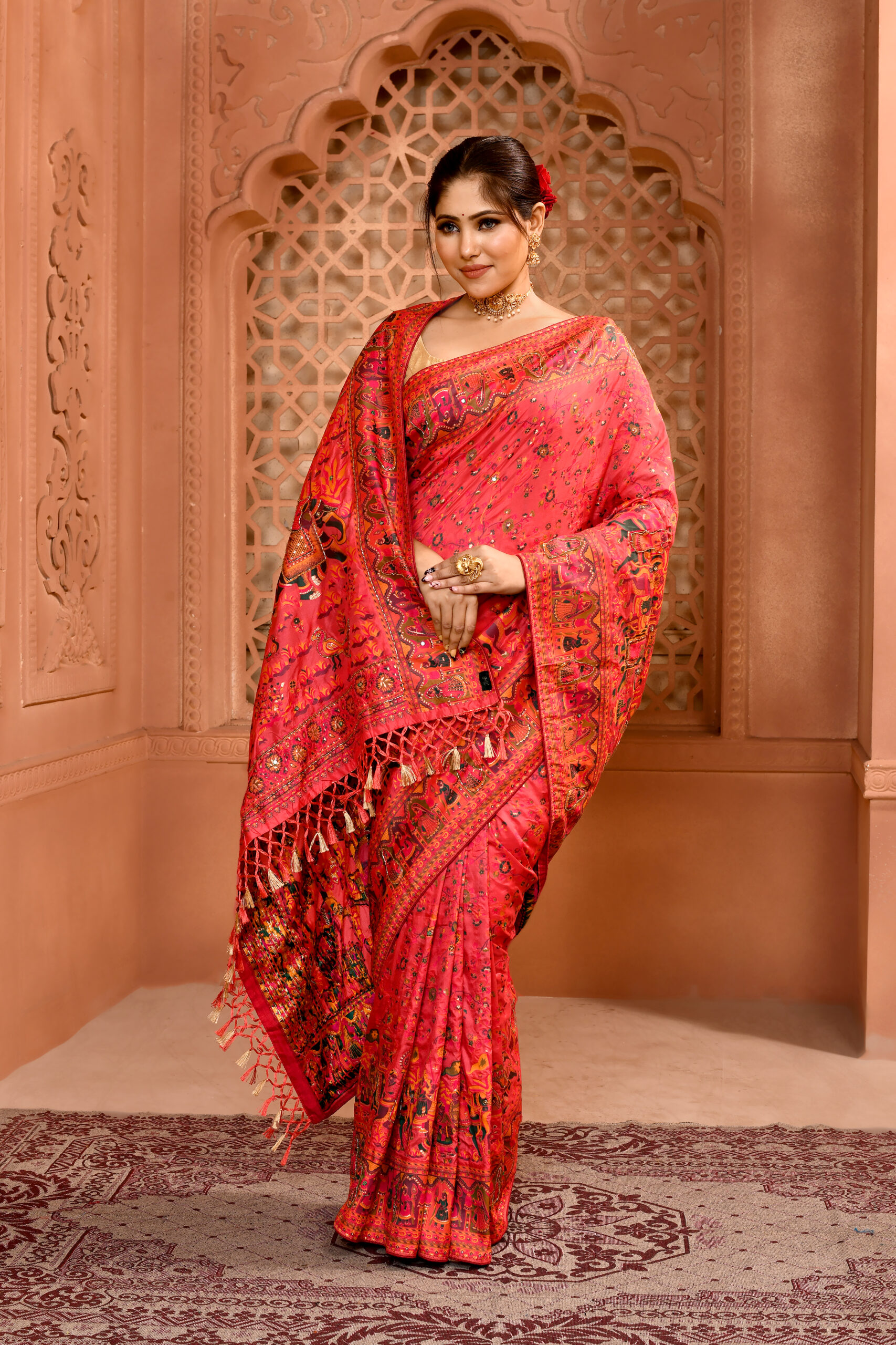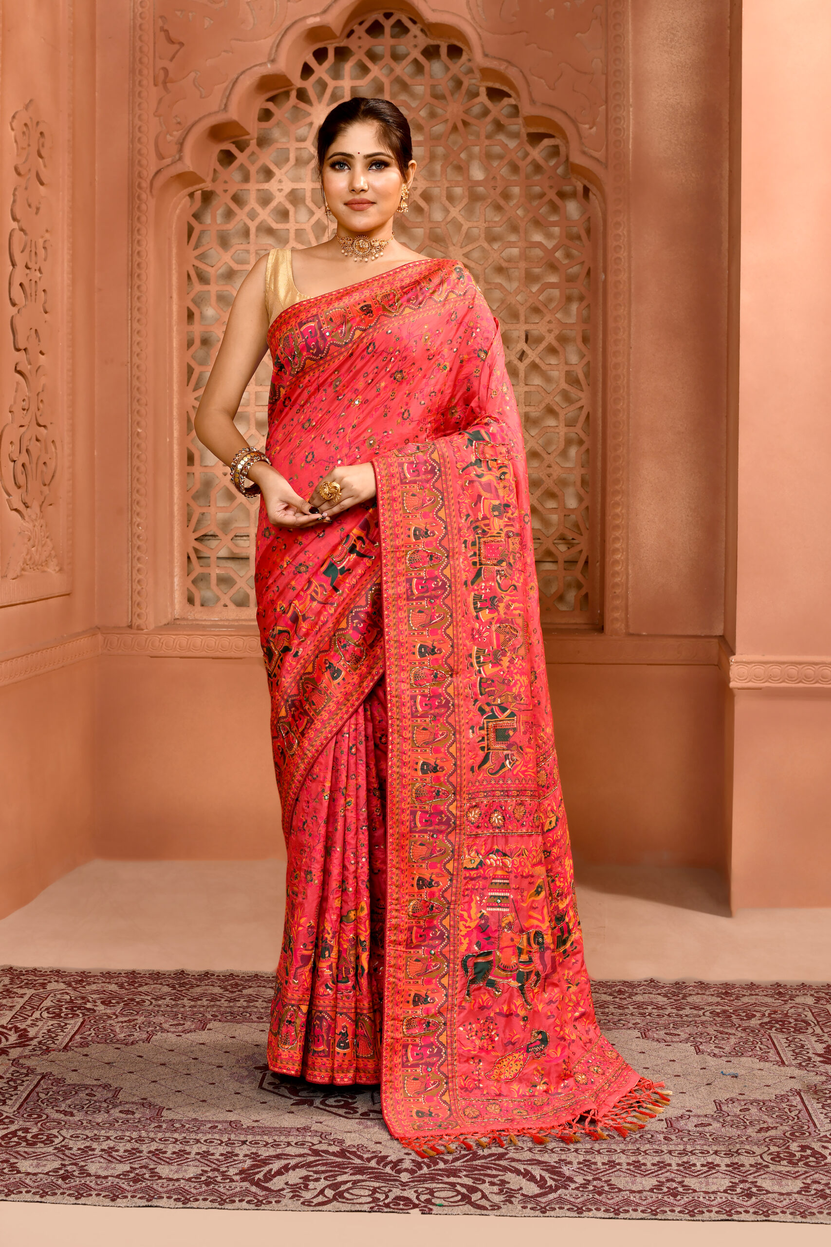 Peach Pink Pashmina Silk Saree with Cutdan WorkPeach Pink Pashmina Silk Saree with Cutdan Work