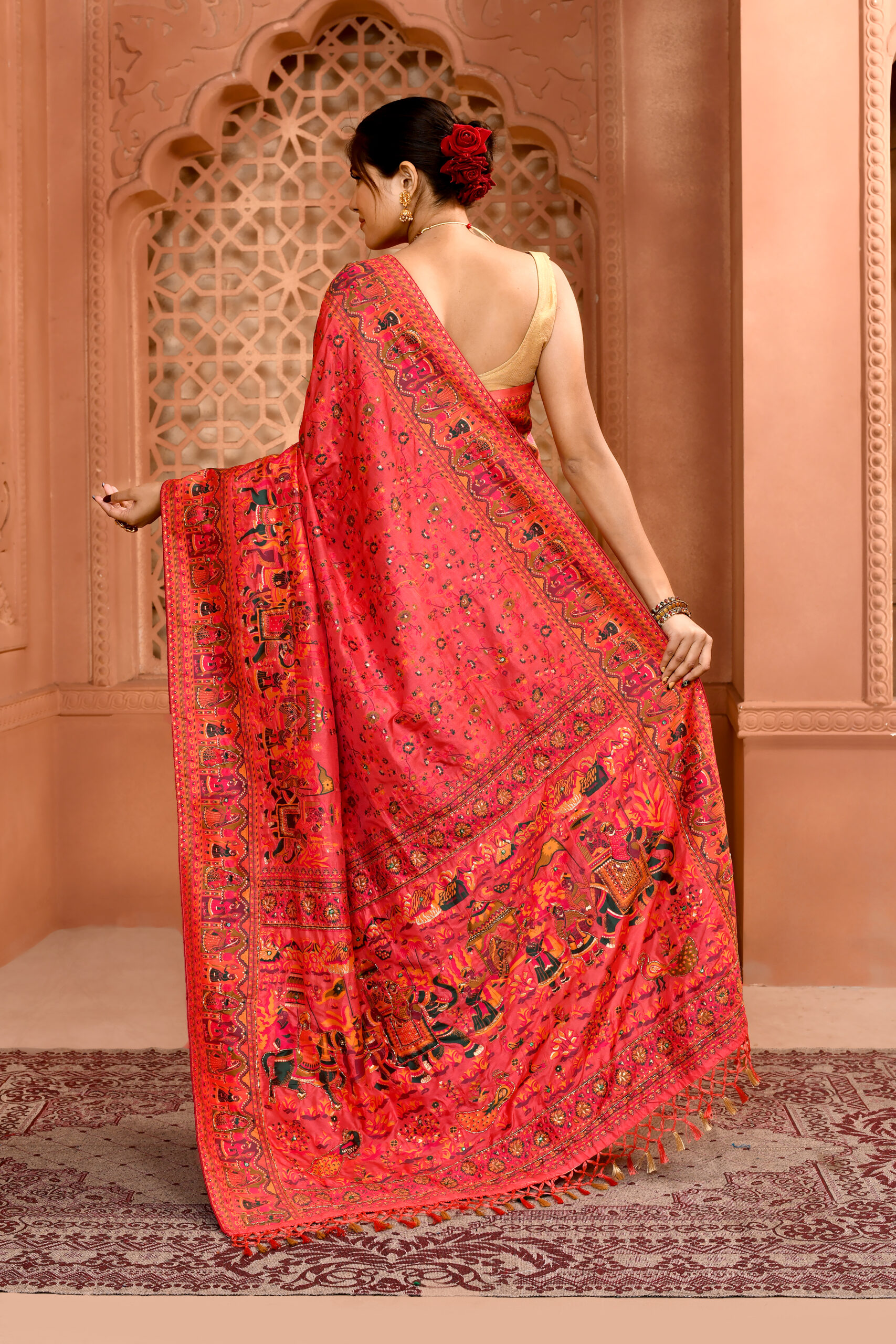 Be the first to review “Peach Pink Pashmina Silk Saree with Cutdan Work”