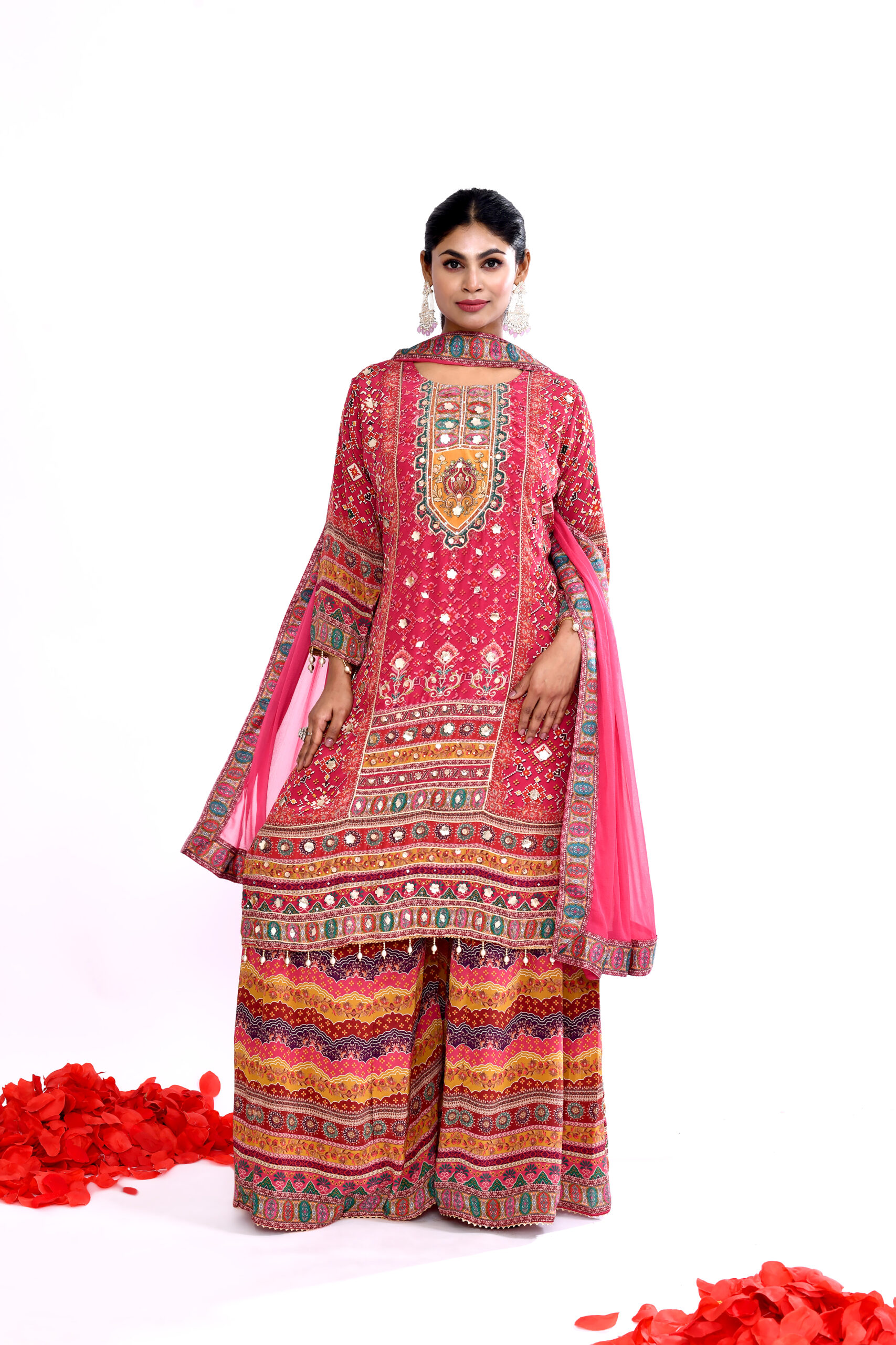 Red Printed Kurta Palazzo Set with Dupatta for Women | Ethnic Festive Straight Kurta Set