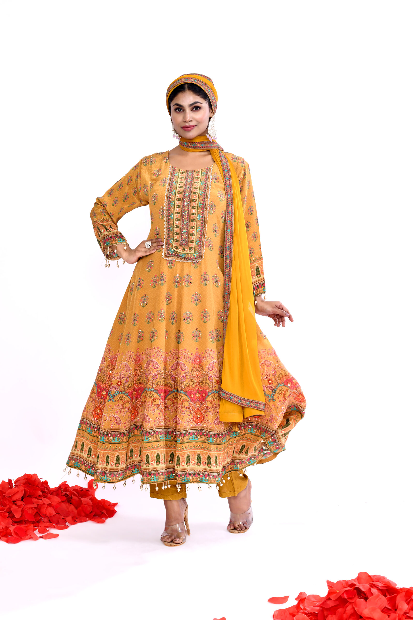 Mustard Printed Anarkali Suit Set with Dupatta